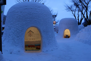 横手の町の広場に、少し大きめのかまくらがいくつも並んでいて、その中からほのかなオレンジ色の灯かりが漏れています。かまくらの中には綿入れを着た子供たちがいて、「いってたんせ」と私たちを呼びます。どれどれと中にはいって子供たちと一緒に座っていると、お餅や甘酒をふるまってくれました。